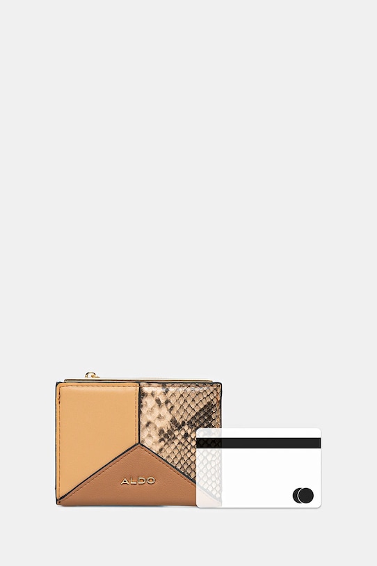 Небольшой кошелек из коллекции Aldo. Изготовлен из экокожи. - Использование соответствующих материалов обеспечивает защиту от технологии RFID, которая использует радиоволны для удалённого считывания данных. Это гарантирует безопасность информации, хранящейся на транспортируемых носителях, таких как банковские карты или паспорта. - Застежка-кнопка. - Карман для монет на молнии. - Внутренние отделения для карт. - Количество слотов для карт: 8. - Размеры: 8,5 х 11 см.
