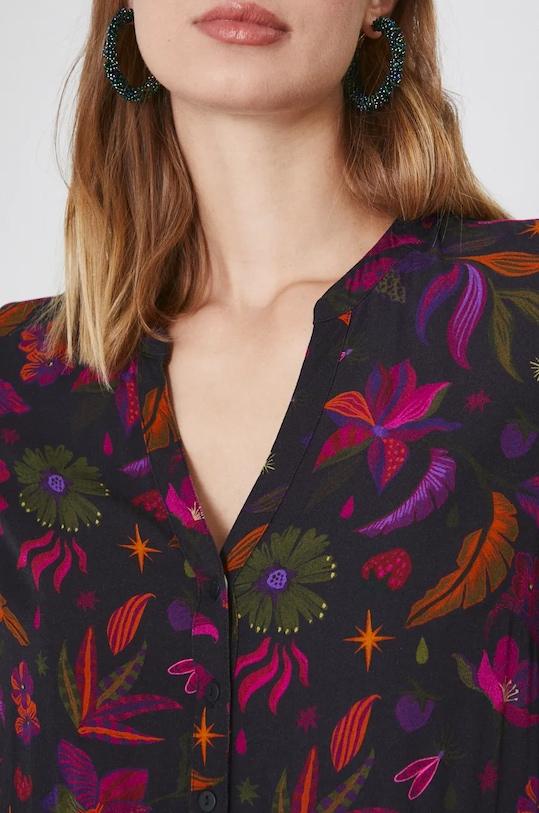 Платье из коллекции «Медицина». Свободного кроя, выполнено из узорчатой ткани. - Большой размер. - Длинный рукав. - Рукава отделаны резинкой. - Острый вырез. - Короткая планка с пуговицами. - Модель с декоративной оборкой. - Декоративные оборки. - Узорчатая ткань. - Узор с растительным мотивом. - Модель мини-длины. - Длина рукава: 62 см. - Ширина груди: 49 см. - Длина: 93 см. - Ширина талии: 48 см. - Размеры указаны для размера: S.