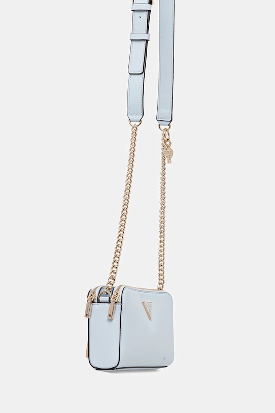 Небольшая сумочка из коллекции Guess. Модель на молнии, выполнена из экокожи. - Застежка-молния и магнитная застежка. - Входящий в комплект тканевый чехол защищает изделие от пыли. - Несъемный, регулируемый ремешок. - Не подходит для формата А4. - Модель на подкладке. - Количество отделений на молнии: 2. - Количество отделений с магнитным замком: 1. - Количество слотов для карт: 3. - Глубина: 5 см. - Высота: 13 см. - Ширина у основания: 23 см.