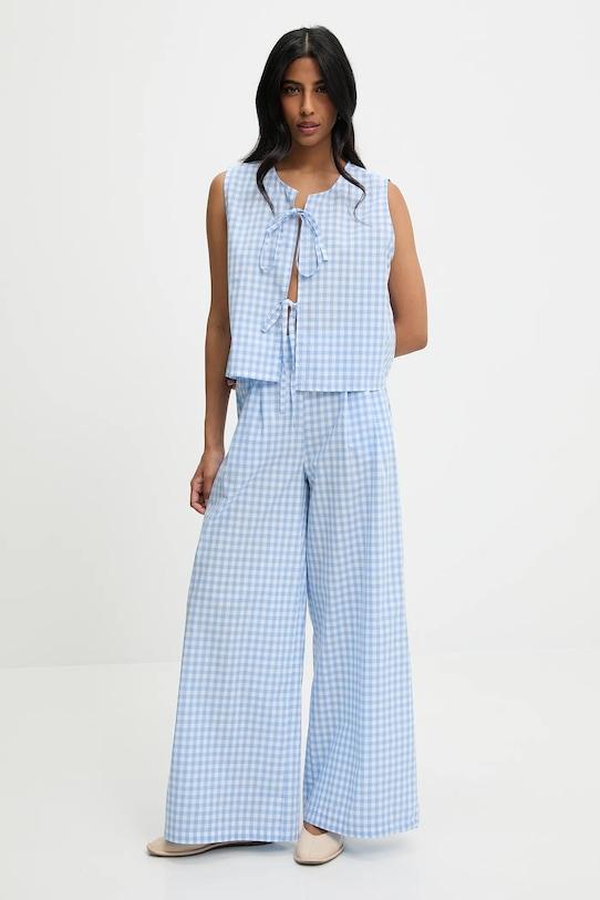 Брюки из коллекции Answear.LAB из тонкой, неэластичной ткани. Модель выполнена из дышащего хлопкового материала. - Брюки слегка приталенные на бедрах. - Свободная нога. - Высокая талия. - Широкий эластичный пояс. - Два боковых накладных кармана. - Ширина талии: 32,5 см. - Ширина бедер: 57 см. - Высота талии: 32,5 см. - Ширина штанины внизу: 37,5 см. - Ширина штанины: 31,5 см. - Длина внешней части штанины: 106,5 см. - Указаны размеры: S/M.