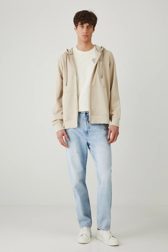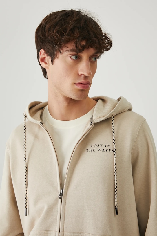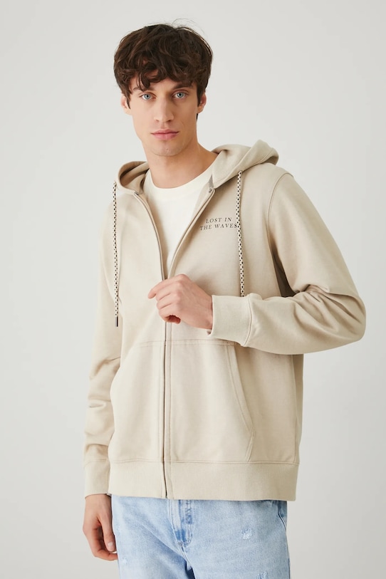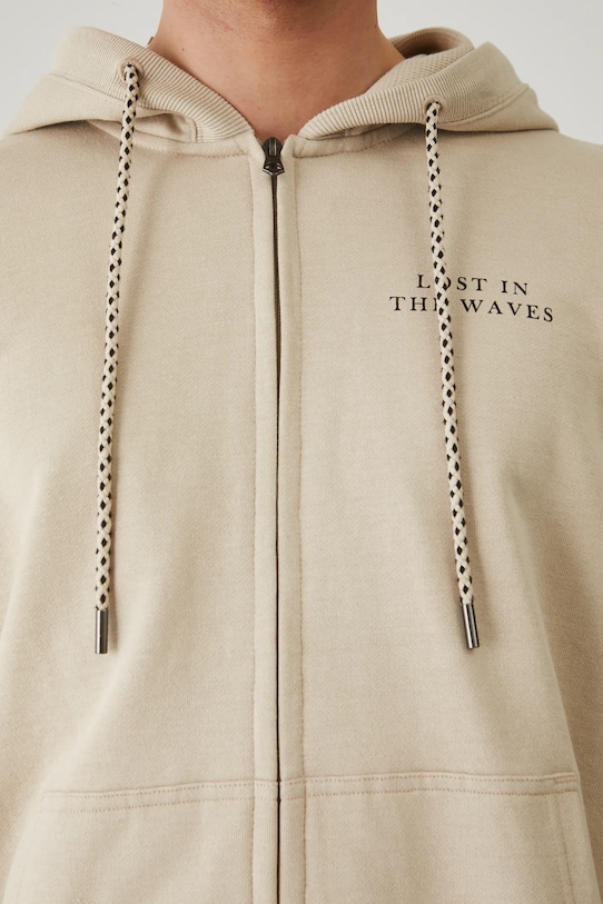 Толстовка с капюшоном из коллекции Medicine. Модель на молнии, выполнена из хлопкового трикотажа. - Обычная посадка. - Длинный рукав. - Капюшон с завязками. - Застежка-молния. - Два боковых накладных кармана. - Отделка ребер. - Модель с принтом. - Печать спереди с надписью: «Затерянные в волнах». - На обороте принт с надписью: найди меня у моря. - Длина рукава: 67 см. - Длина: 74 см. - Ширина груди: 61 см. - Размеры указаны для размера: L.