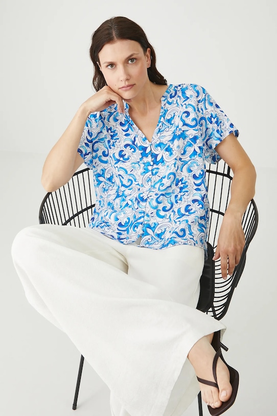 Эта блузка из коллекции Medicine выполнена из узорчатой ткани и имеет заостренный вырез. - Материал с сертификатом OEKO-TEX Standard 100 гарантирует, что текстильные изделия, на которых он нанесен, не содержат вредных и потенциально опасных для человека и окружающей среды веществ. - Обычная посадка. - Короткие рукава реглан. - Острый вырез. - Застежка на пуговицы. - Узорчатая ткань. - Длина: 63 см. - Ширина груди: 55 см. - Размеры указаны для размера: S.