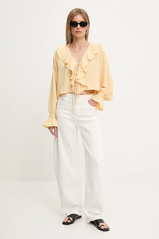 Эта блузка Answear.LAB выполнена из тонкой, неэластичной ткани. Полиэстер обеспечивает лучшую устойчивость к сминанию. - Свободный крой, обеспечивающий полную свободу движений. - Длинный рукав. - Рукава отделаны удобными эластичными манжетами. - Крой рукава со спущенной линией плеча не стесняет движений. - Модель с декоративными оборками. - Модель с регулируемой шнуровкой. - Длина: 46 см. - Ширина под мышками: 58 см. - Размеры указаны для размера: S.