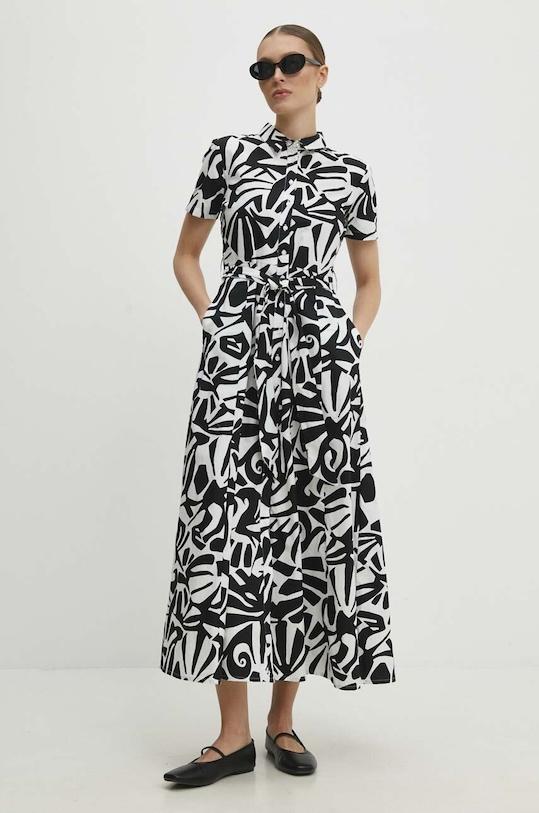 Это платье из коллекции Answear.LAB выполнено из ткани с рисунком. Модель выполнена из дышащего хлопкового материала. - Расклешенный крой. - Модель с воротником. - Короткий рукав. - Удобная застежка на кнопки позволяет легко надевать и снимать. - Текстильный ремешок в комплекте. - Два боковых накладных кармана. - Тонкая, неэластичная ткань. - Длина: 135 см. - Ширина под мышками: 42 см. - Ширина талии: 34 см. - Размеры указаны для размера: S.