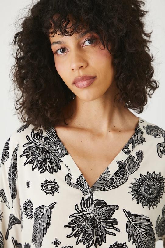 Эта блузка из коллекции Medicine выполнена из узорчатой ткани и имеет заостренный вырез. - Материал с сертификатом OEKO-TEX Standard 100 гарантирует, что текстильные изделия, на которых он нанесен, не содержат вредных и потенциально опасных для человека и окружающей среды веществ. - Обычная посадка. - Рукав три четверти. - Заниженная линия плеча. - Острый вырез. - Узорчатая ткань. - Длина: 61 см. - Ширина груди: 54 см. - Размеры указаны для размера: S.