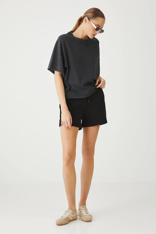 Шорты из коллекции «Медицина». Изготовлены из гладкого трикотажного полотна. - Свободный покрой. - Обхват талии обычный. - Эластичный пояс со шнурками. - Накладные карманы. - Модель выполнена из ткани френч-терри. - Гладкая трикотажная ткань. - Ширина талии (до растягивания): 34,5 см. - Ширина талии (после растяжения): 44 см. - Ширина бедер: 50,5 см. - Высота талии: 28 см. - Длина по внутреннему шву: 10 см. - Размеры указаны для размера: S.