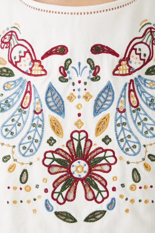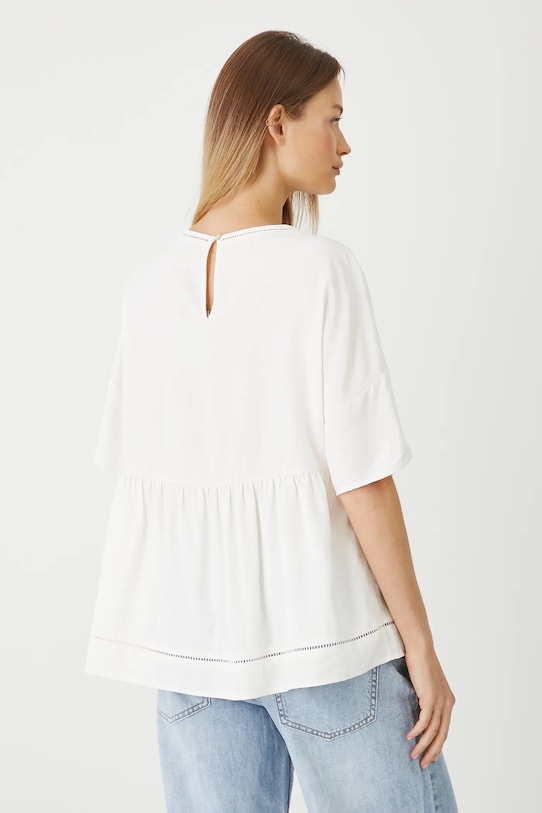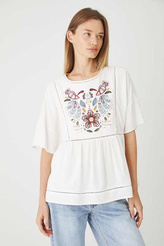 Эта блузка из коллекции Medicine выполнена из смесовой льняной ткани и имеет круглый вырез. - Материал с добавлением льна обеспечивает комфорт и воздухопроницаемость. - Большой размер. - Короткий рукав. - Заниженная линия плеча. - Круглый вырез. - Застегивается на пуговицы сзади. - Модель с декоративной оборкой. - Декоративные вставки. - Модель с декоративной вышивкой. - Длина: 64 см. - Ширина груди: 52 см. - Размеры указаны для размера: S.