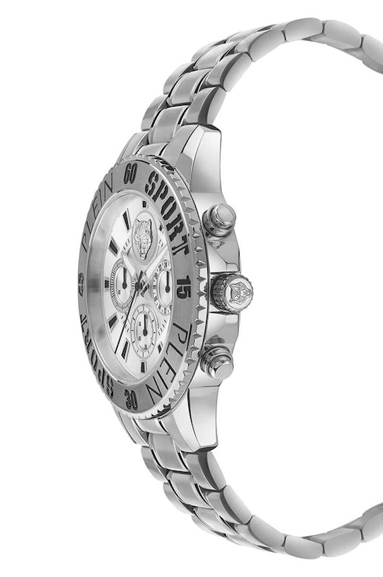 Часы из коллекции PLEIN SPORT. Модель с круглым циферблатом и сегментированным браслетом. Упакованы в фирменную коробку. - Материал корпуса: сталь. - Форма корпуса: круглая. - Сегментированный браслет. - Водонепроницаемость: WR. 50M (5ATM) - устойчив к брызгам, плаванию на поверхности. - Стекло: минеральное (закаленное, очень устойчивое к ударам, трудно царапается). - Механизм: кварцевый, питание от батареек. - Имеется хронограф. - Ширина корпуса: 44 мм.