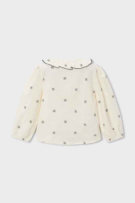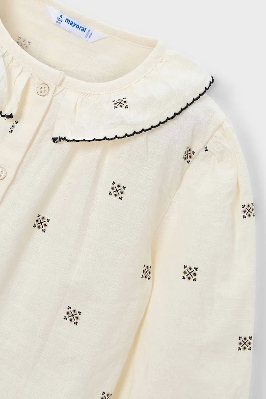 Детская блузка из коллекции Mayoral выполнена из тонкой, неэластичной ткани. Модель выполнена из исключительно комфортного и дышащего материала, идеально подходящего для теплого времени года. - Модель изготовлена из волокон, полученных с использованием экологически безопасных производственных процессов, что позволяет снизить воздействие на окружающую среду. - Простой дизайн, не стесняющий движений. - Длинный рукав. - Модель с воротником. - Застежка на пуговицы.