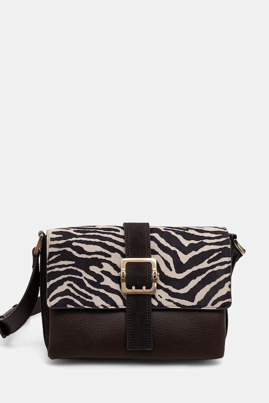 Сумка среднего размера из коллекции Medicine. Модель на молнии выполнена из комбинации экокожи и синтетического материала. - Клапан застегивается на магнит. - Имеет три отделения: одно на молнии, два на магнитной застежке. - Внутренний карман на молнии. - Несъемный, регулируемый ремешок. - Материал с текстурой. - Узор «зебра». - Модель на подкладке. - Не подходит для формата А4. - Глубина: 15 см. - Высота: 19 см. - Ширина у основания: 23 см.