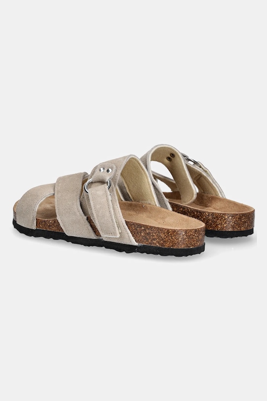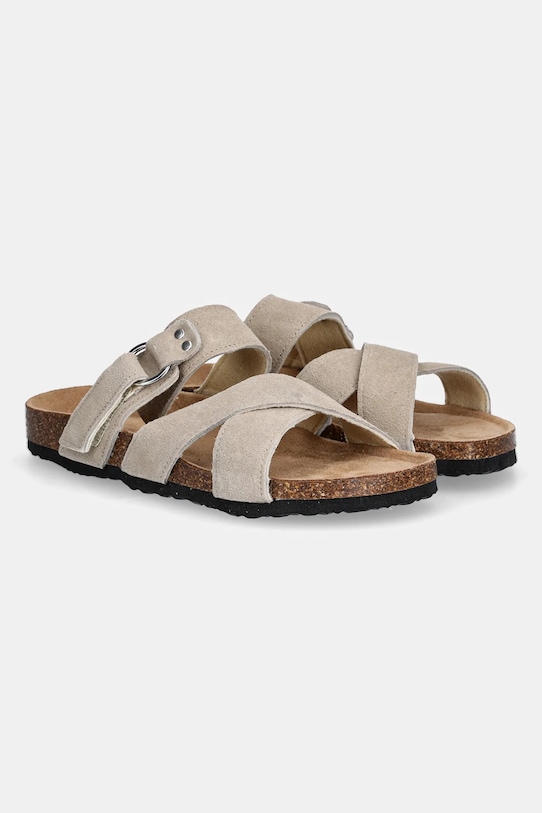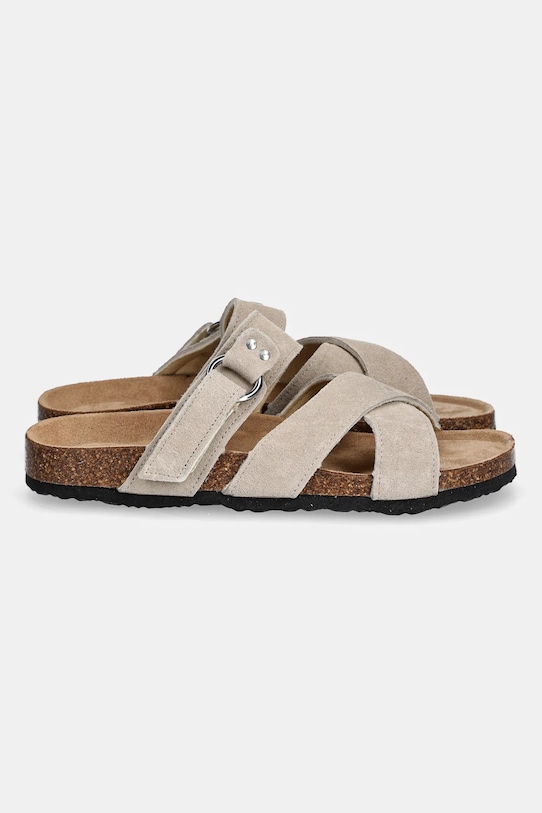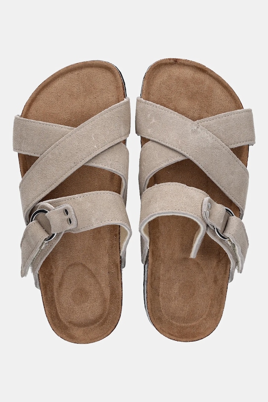 Эти шлёпанцы Answear.LAB изготовлены из замши. Эти лёгкие и удобные слипоны идеально подходят для повседневной носки. - Застежка-пряжка со штифтом для индивидуальной подгонки. - Пробковая стелька анатомической формы повышает комфорт и поддерживает стопу. - Текстильная внутренняя часть комфортна для ног и облегчает содержание обуви в чистоте. - Подошва из пеноматериала обеспечивает более мягкое ощущение и дополнительную амортизацию. - Модель на плоской подошве.