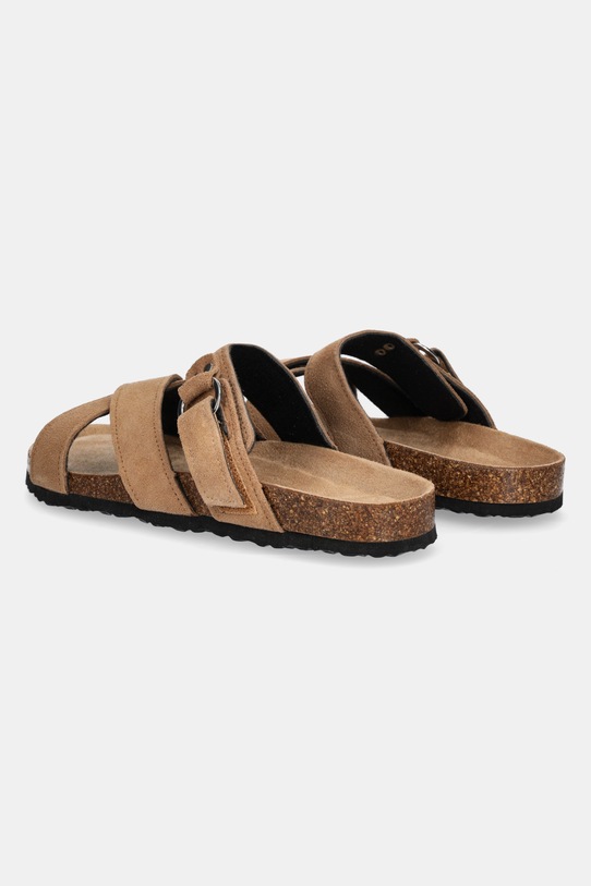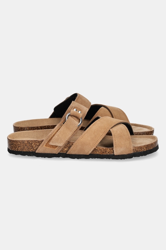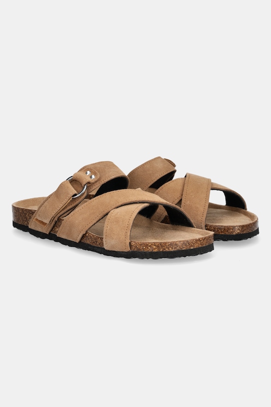 Эти шлёпанцы Answear.LAB изготовлены из замши. Эти лёгкие и удобные слипоны идеально подходят для повседневной носки. - Застежка-пряжка со штифтом для индивидуальной подгонки. - Пробковая стелька анатомической формы повышает комфорт и поддерживает стопу. - Текстильная внутренняя часть комфортна для ног и облегчает содержание обуви в чистоте. - Подошва из пеноматериала обеспечивает более мягкое ощущение и дополнительную амортизацию. - Модель на плоской подошве.