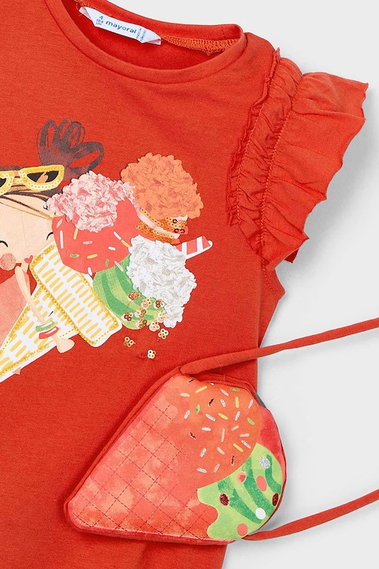 Детское платье из коллекции Mayoral. Простой крой, выполнено из трикотажного полотна с принтом. Приятный на ощупь хлопковый материал. – Инициатива «Лучший хлопок». Изделия с этой маркировкой содержат не менее 50% хлопка от розничного продавца или бренда, участвующего в инициативе «Лучший хлопок» и инвестирующего в развитие BCI. - Простой дизайн, не стесняющий движений. - Короткий рукав. - Модель с декоративными оборками. - Круглый вырез. - Модель с принтом.