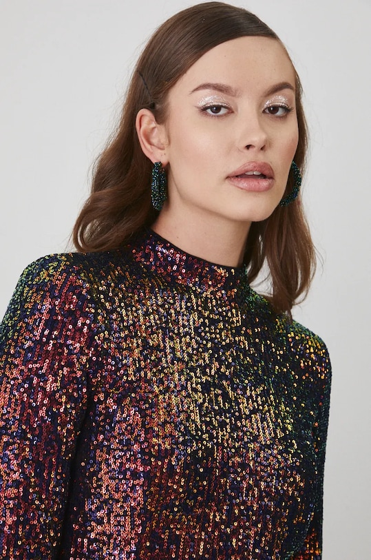 Платье из коллекции «Медицина». Приталенная модель из материала с пайетками. - Приталенный крой. - Длинный рукав. - Модель с водолазкой. - Декоративный вырез сзади. - Застегивается на пуговицы сзади. - Застежка-молния. - Модель выполнена из материала с пайетками. - Модель на подкладке. - Модель мини-длины. - Длина рукава: 61,5 см. - Ширина груди: 39 см. - Ширина талии: 32 см. - Длина: 89 см. - Размеры указаны для размера: S.