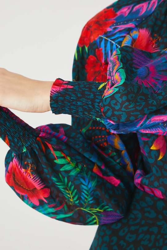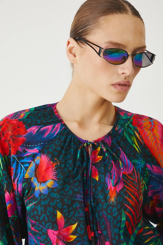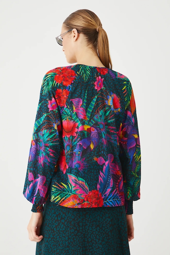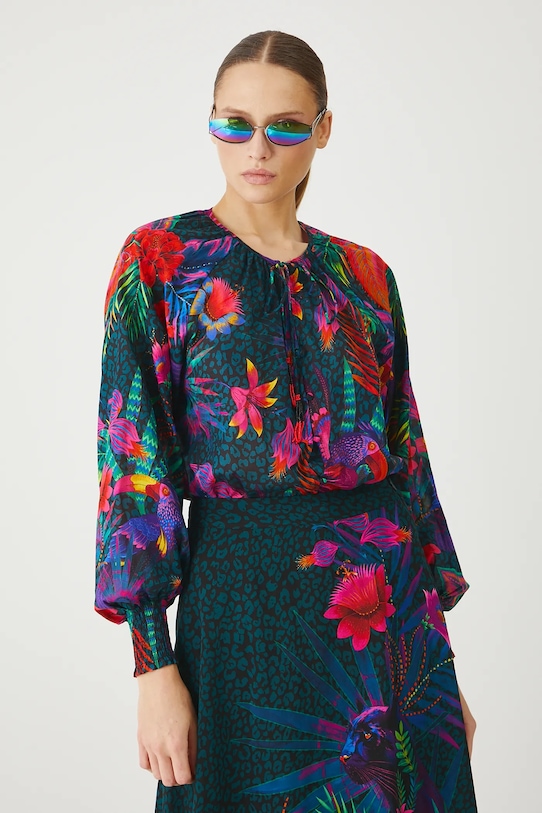 Эта блузка из коллекции Medicine выполнена из хлопчатобумажной ткани и имеет круглый вырез с завязкой. - Обычная посадка. - Длинные рукава реглан. - Объемные рукава с ребристыми манжетами. - Круглый вырез горловины с декоративной шнуровкой. - Застежка на пуговицы. - Узорчатая ткань. - Узор с растительными и животными мотивами. - Длина рукава (от горловины): 73 см. - Ширина груди: 50 см. - Длина: 63 см. - Размеры указаны для размера: S.
