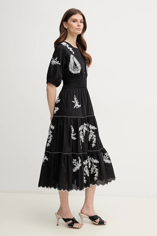 Лёгкое платье из коллекции Pepe Jeans, выполненное из ткани с декоративной вышивкой. Этот тонкий материал идеально подходит для тёплого времени года. - Расклешенный крой. - Застежка на короткие пуговицы обеспечивает эффективную вентиляцию и легкость надевания и снимания. - Короткие рукава с буфами. - Материал с металлической нитью. - Два боковых накладных кармана. - Длина: 125 см. - Ширина под мышками: 45 см. - Размеры указаны для размера: S.