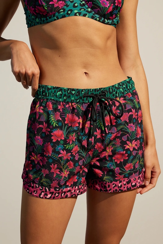 Плавки-шорты из коллекции Medicine. Изготовлены из ткани с узором. - Обхват талии обычный. - Эластичный пояс со шнурками. - Два прорезных боковых кармана на молнии. - Узорчатое трикотажное полотно. - Узор с растительным мотивом. - Леопардовый узор. - Ширина талии (до растягивания): 38,5 см. - Ширина талии (после растяжения): 46 см. - Ширина бедер: 54 см. - Высота талии: 28 см. - Длина: 7 см. - Размеры указаны для размера: S.