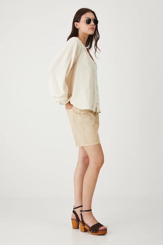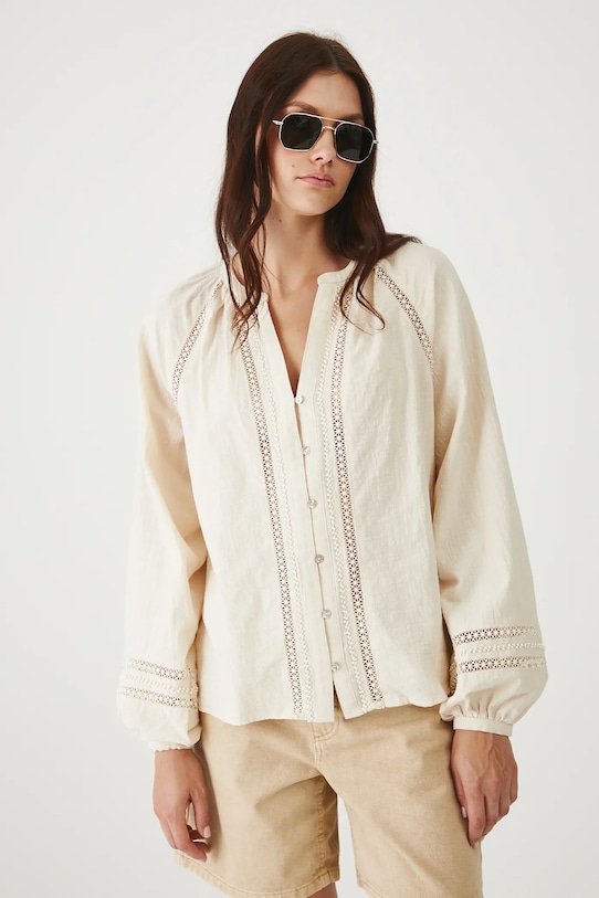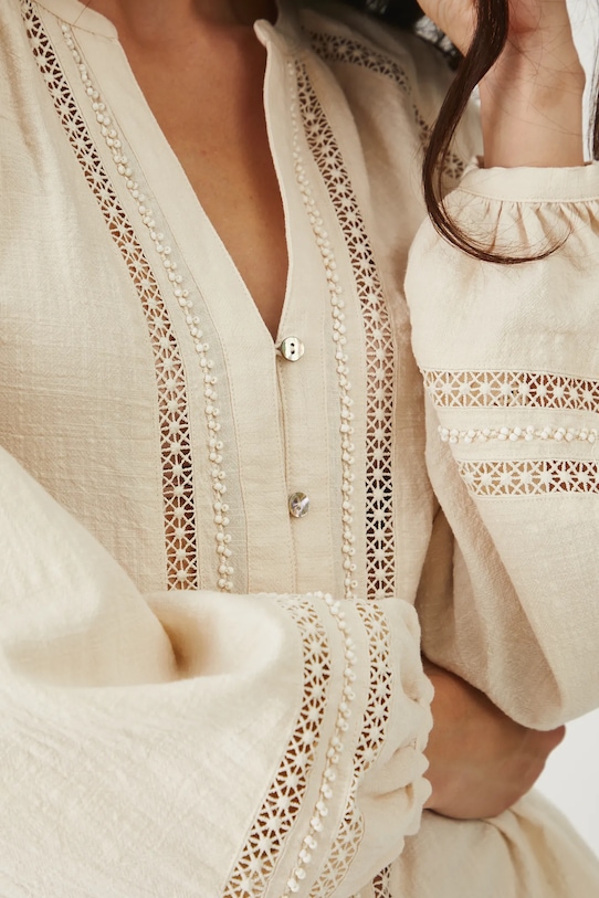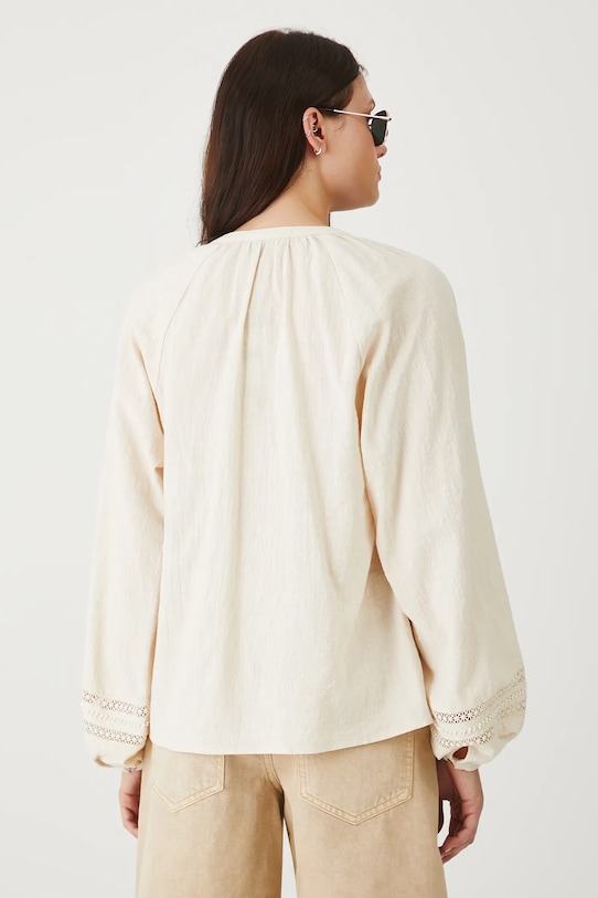 Эта блузка из коллекции Medicine выполнена из ткани с декоративными вставками и имеет заостренный вырез. - Обычная посадка. - Длинные рукава реглан. - Манжеты на пуговицах. - Острый вырез. - Застежка на пуговицы. - Декоративные вставки. - Модель с аппликацией из бисера. - Модель выполнена из хлопчатобумажной ткани. - Длина рукава (от горловины): 72 см. - Длина: 62 см. - Ширина груди: 52 см. - Размеры указаны для размера: S.