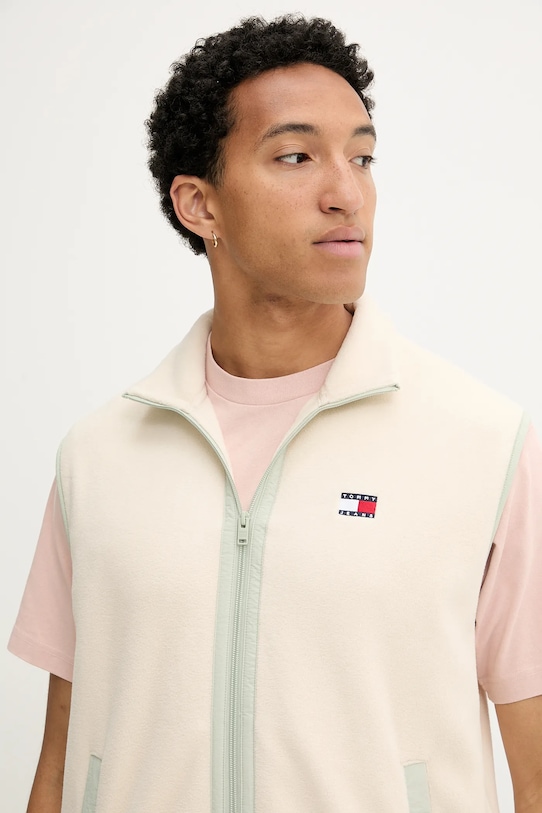 Жилет из коллекции Tommy Jeans. Модель без подкладки выполнена из флиса. Материал мягкий и приятный на ощупь. - Данное изделие частично изготовлено из переработанного полиэстера. - Застежка-молния. - Два боковых кармана с застежкой на кнопку. - Нижний край и проймы отделаны эластичной тесьмой, что обеспечивает лучшее прилегание изделия к телу и облегчает надевание. - Длина: 73 см. - Ширина под мышками: 58 см. - Размеры указаны для размера: M.