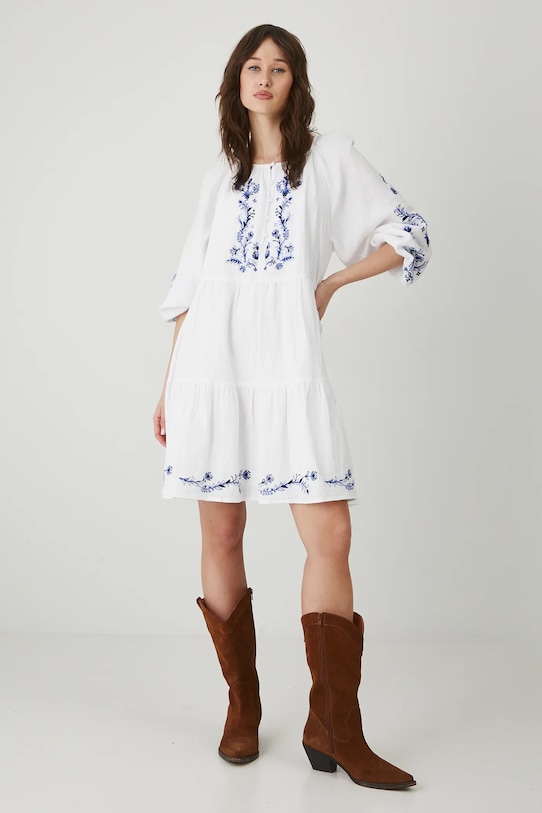 Платье из коллекции «Медицина». Свободного кроя, выполнено из хлопковой ткани. - Свободный покрой. - Рукав три четверти. - Рукав реглан. - Рукава отделаны резинкой. - Круглый вырез. - Короткая планка с пуговицами. - Модель с декоративными оборками. - Модель с декоративной вышивкой с растительным мотивом. - Модель мини-длины. - Ширина талии: 50 см. - Ширина груди: 50 см. - Длина: 90 см. - Размеры указаны для размера: S.