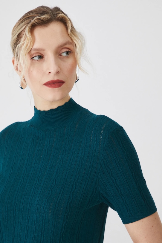 Футболка из коллекции «Медицина». Изготовлена из фактурного трикотажа. - Материал с сертификатом OEKO-TEX Standard 100 гарантирует, что текстильные изделия, на которых он нанесен, не содержат вредных и потенциально опасных для человека и окружающей среды веществ. - Приталенный крой. - Короткий рукав. - Модель с водолазкой. - Материал со структурированным рисунком. - Длина: 55 см. - Ширина груди: 40 см. - Размеры указаны для размера: S.