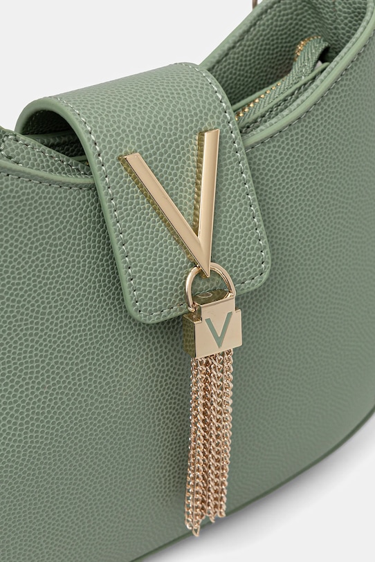 Небольшая сумочка из коллекции Valentino Bags. Застегивается на молнию, выполнена из экокожи. - Застежка-молния и магнитная застежка. - Имеет съемную ручку и съемный нерегулируемый ремень. - Не подходит для формата А4. - Входящий в комплект тканевый чехол защищает изделие от пыли. - Модель на подкладке. - Имеет два внутренних кармана: один прорезной, другой на молнии. - Глубина: 5,5 см. - Высота: 17 см. - Ширина у основания: 22 см.