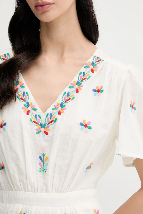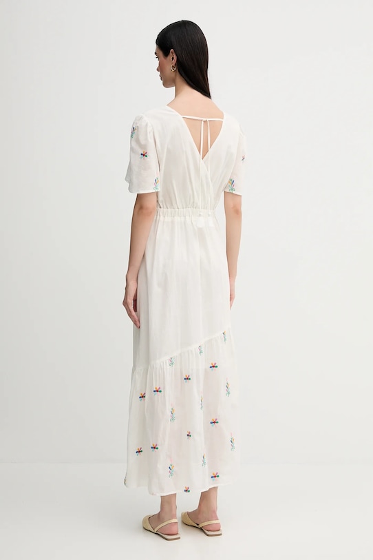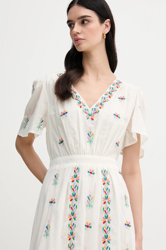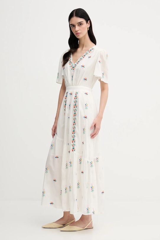 Это платье из коллекции La Petite Française выполнено из тонкой, неэластичной ткани. Модель выполнена из дышащего хлопкового материала. - Модель макси длины. - Расклешенный крой. - Острый вырез. - Короткий рукав. - Завязывается сзади. - Эластичная вставка сзади. - Дополнительный слой материала в виде подкладки. - Модель с декоративной вышивкой. - Длина: 132 см. - Ширина под мышками: 50 см. - Размеры указаны для размера: 36.
