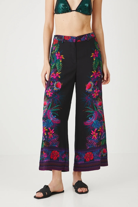 Брюки из коллекции «Медицина». Изготовлены из узорчатой ткани. - Фасон кюлотов. - Модель со стандартной талией, застежкой на пуговицы и молнию. - Накладные карманы. - Широкие штанины. - Узорчатая ткань. - Узор с растительными и животными мотивами. - Ширина талии: 37,5 см. - Ширина бедер: 52,5 см. - Высота талии: 29 см. - Ширина штанины внизу: 34,5 см. - Длина по внутреннему шву: 65 см. - Размеры указаны для размера: S.
