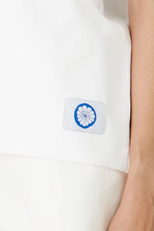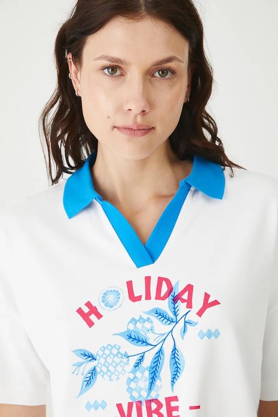 Футболка из коллекции «Медицина». Изготовлена из хлопчатобумажной ткани интерлок. - Большой размер. - Короткий рукав. - Заниженная линия плеча. - Острый вырез с воротником. - Модель с принтом. - Печать спереди с надписью: Праздничное настроение. Положительная энергия. - Декоративная заплатка. - Хлопчатобумажная ткань интерлок с плотным переплетением. - Длина: 64 см. - Ширина груди: 56 см. - Размеры указаны для размера: S.