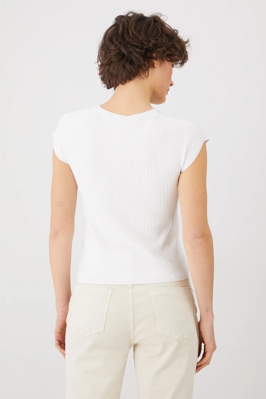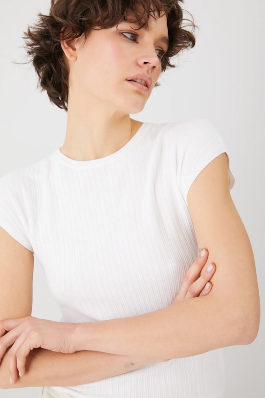 Футболка из коллекции «Медицина». Изготовлена из трикотажной ткани в рубчик. - Материал с сертификатом OEKO-TEX Standard 100 гарантирует, что текстильные изделия, на которых он нанесен, не содержат вредных и потенциально опасных для человека и окружающей среды веществ. - Приталенный крой. - Короткие рукава кимоно. - Круглый вырез. - Трикотажное полотно в рубчик. - Длина: 53 см. - Ширина груди: 39 см. - Размеры указаны для размера: S.