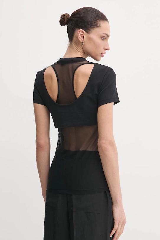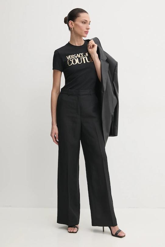 Эта футболка из коллекции Versace Jeans Couture выполнена из комбинации двух разных материалов. Эта модель выполнена из исключительно комфортного и дышащего материала. - Простой дизайн, не стесняющий движений. - Круглый ребристый вырез. - Короткий рукав. - Модель с тюлевыми вставками. - Декоративные вырезы на спине. - Модель с аппликацией из пайеток. - Длина: 62 см. - Ширина под мышками: 42 см. - Размеры указаны для размера: S.