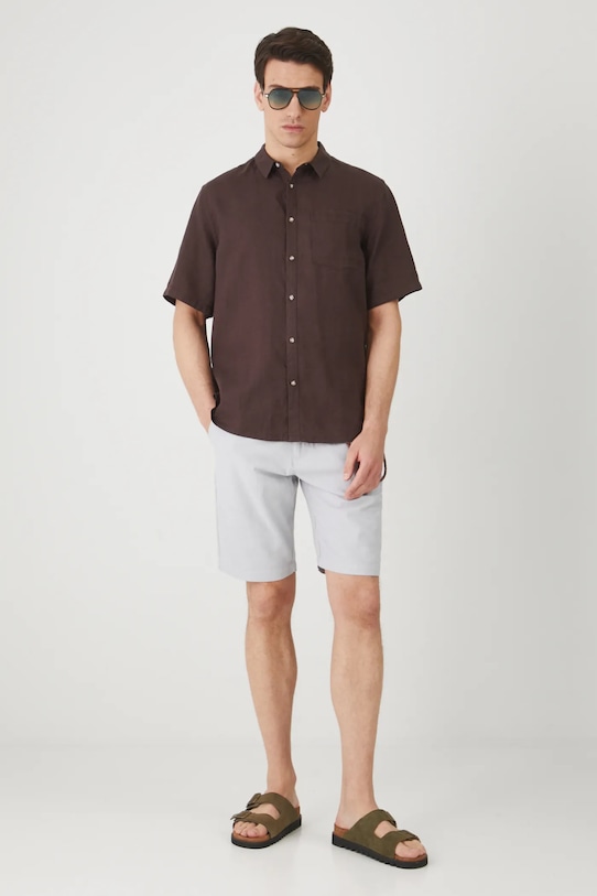 Шорты из коллекции Medicine. Изготовлены из смеси льна и хлопка. - Обычная посадка. - Обхват талии обычный. - Застежка на пуговицы и молнию. - Накладные карманы. - Декоративные закладки. - Декоративная деталь с карабином. - Меланжевая ткань. - Ширина талии: 44,8 см. - Ширина бедер: 57 см. - Высота талии: 27,2 см. - Ширина штанины внизу: 25,9 см. - Длина по внутреннему шву: 26 см - Размеры указаны для размера: L.
