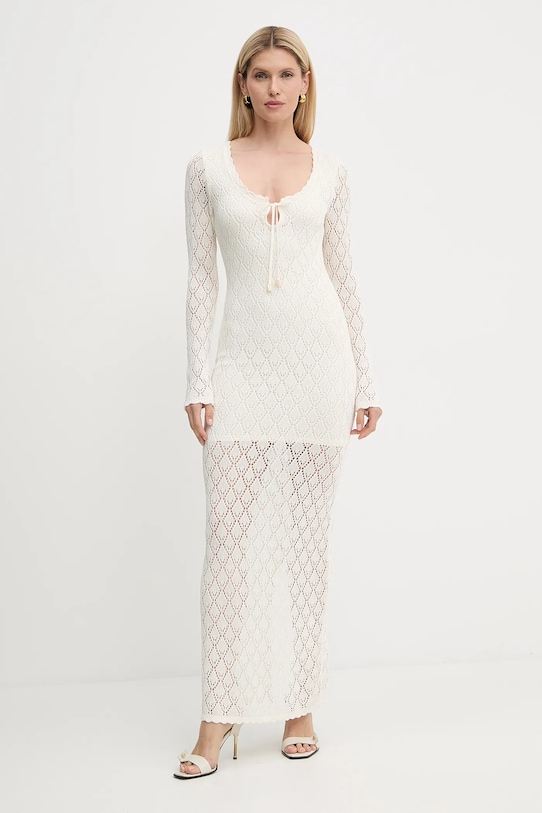 Это платье из коллекции Guess выполнено из ажурного трикотажа. Модель выполнена из дышащего вискозного материала. - Модель макси длины. - Простой дизайн. - Модель выполнена из ажурного материала. - Декоративная окантовка по вырезу горловины. - Длинные, прилегающие рукава. - У него есть щель. - Модель на подкладке. - Длина: 152 см. - Ширина под мышками: 39 см. - Ширина талии: 30 см. - Размеры указаны для размера: S.