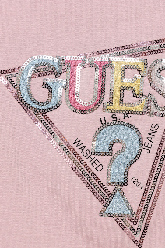 Детская футболка из коллекции Guess выполнена из тонкой, эластичной ткани. Модель выполнена из исключительно комфортного материала с высоким содержанием хлопка. - Органический хлопок выращивается без использования вредных химикатов, химических пестицидов и искусственных удобрений. - Простой дизайн, не стесняющий движений. - Классический круглый вырез. - Плоские швы защищают кожу от ссадин и раздражения. - Модель с аппликацией из пайеток.