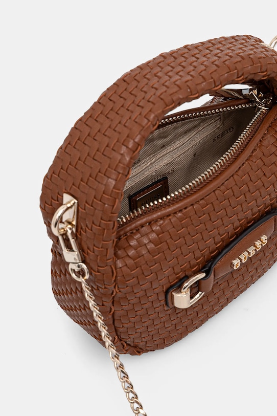 Небольшая сумочка из коллекции Guess. Модель на молнии, выполнена из экокожи. - Застежка-молния. - Модель на подкладке. - Имеет внутренний карман на молнии и отделения для карт. - Сумка для ношения в руке или на плече. - Имеет ручку и съемный нерегулируемый ремень. - Не подходит для формата А4. - Входящий в комплект тканевый чехол защищает изделие от пыли. - Глубина: 7 см. - Высота: 11 см. - Ширина у основания: 18 см.