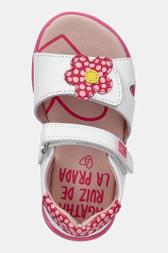 Детские сандалии из коллекции Agatha Ruiz de la Prada из натуральной кожи. Подошва прочная и устойчивая к истиранию из резины. - Модель с гибкой подошвой. - Ремешки с застежкой-липучкой для удобного застегивания позволяют индивидуально регулировать размер. - Усиленный задник обеспечивает отличную поддержку лодыжки и пятки. - Резиновая подошва прочная и устойчивая к повреждениям. - Длина вставки: 13 см. - Размеры указаны для размера: 22.