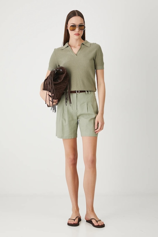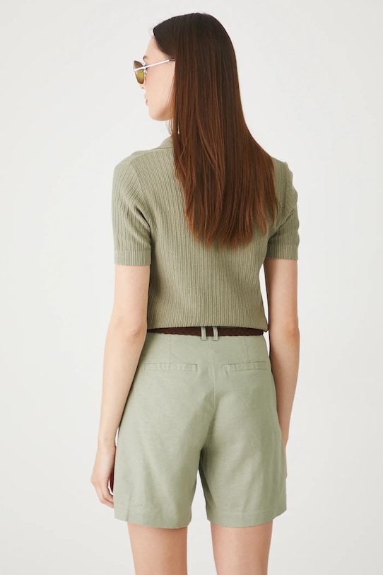 Шорты из коллекции Medicine. Изготовлены из смеси льна и вискозы. - Морковный стиль. - Модель с высокой талией, застежкой на молнию и крючок. - В комплект входит плетеный ремешок. - Накладные карманы. - Декоративные закладки. - Гладкая ткань. - Ширина талии: 36 см. - Ширина бедер: 51,5 см. - Высота талии: 29 см. - Ширина штанины внизу: 29 см. - Длина по внутреннему шву: 16 см. - Размеры указаны для размера: S.