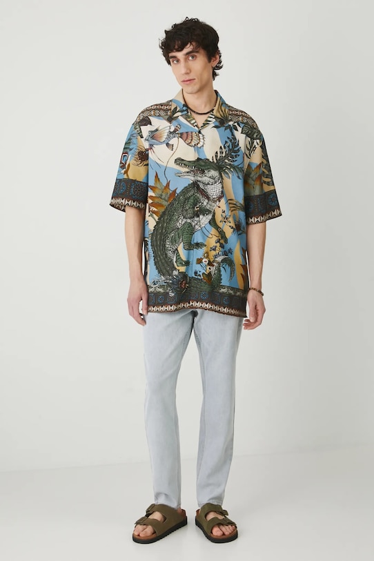 Эта рубашка из коллекции Medicine. Она сшита из ткани с узором и имеет воротник-стойку. - Рубашка свободного кроя отличается свободным кроем, обеспечивает комфорт и не стесняет движений. - Короткий рукав. - Мягкий курортный воротник. - Застежка на пуговицы. - Узорчатая ткань. - Узор с растительными и животными мотивами. - Длина: 80 см. - Ширина груди: 63 см. - Ширина плеч: 55,7 см. - Размеры указаны для размера: L.