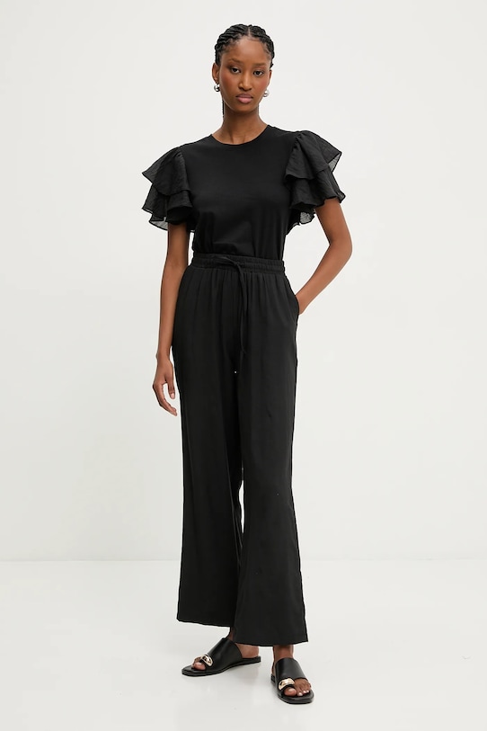Брюки из коллекции Answear.LAB из смеси льна и хлопка. Изготовлены из дышащего материала с высоким содержанием льна. - Прямые, широкие штанины. - Высокая талия с эластичным поясом. - Регулируемая талия со шнурками для индивидуальной посадки. - Два боковых накладных кармана. - Ширина талии: 30,5 см. - Ширина бедер: 47 см. - Высота талии: 30 см. - Длина по внутреннему шву: 70,5 см. - Размеры указаны для размера: S.