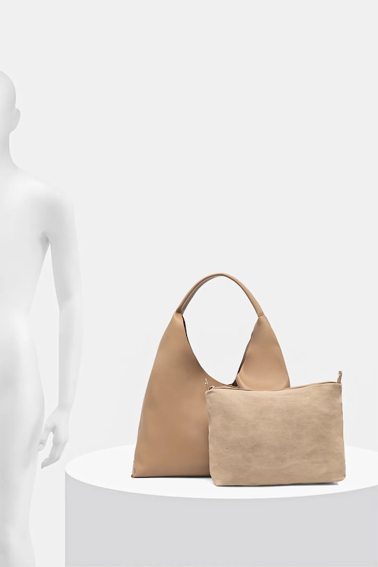 Большая сумка из коллекции Answear.LAB. Модель на молнии, выполнена из экокожи. - Застежка-кнопка. - Съемное отделение на подкладке с застежкой-молнией. - Три внутренних кармана: один на молнии, два накладных. - Длинная ручка для удобной переноски в руке или на плече. - Вмещает формат А4. - Входящий в комплект тканевый чехол защищает изделие от пыли. - Глубина: 11 см. - Высота: 27 см. - Ширина у основания: 42 см.