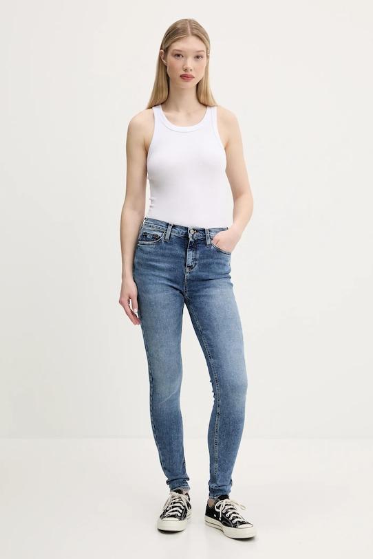 Джинсы Tommy Jeans скинни с высокой талией. Изготовлены из гладкого денима. - Экологически чистый переработанный хлопок снижает воздействие на окружающую среду за счет сокращения использования химикатов и экономии воды и энергии, улучшая условия жизни и экономическое развитие в регионах производства хлопка. - Модель с высокой талией, застежкой на пуговицы и молнию. - Три накладных кармана спереди. - Два накладных кармана на ягодицах.