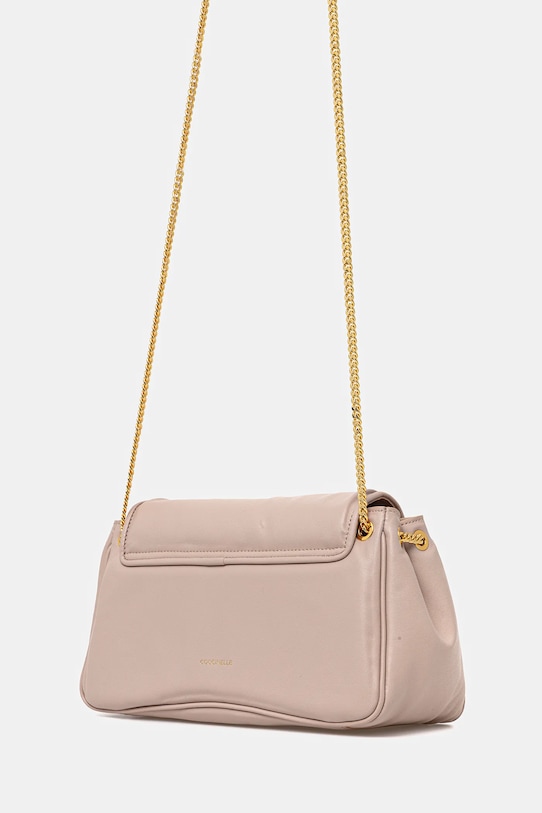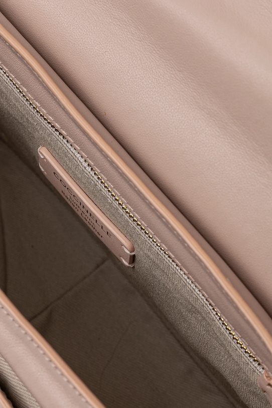Небольшая сумочка из коллекции Coccinelle. Модель на молнии, выполнена из натуральной кожи. - Не подходит для формата А4. - Цепь прикреплена постоянно. - Клапан застегивается на магнит. - Накладной карман спереди. - Внутренний карман на молнии. - Входящий в комплект тканевый чехол защищает изделие от пыли. - Модель с декоративной аппликацией. - Глубина: 12 см. - Высота: 15 см. - Ширина у основания: 28 см.