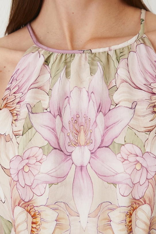 Платье из коллекции «Медицина». Расклешенный фасон из узорчатой ткани. - Расклешенный крой. - Модель без рукавов. - Вырез-чокер. - Завязывается сзади. - Эластичный пояс. - Узорчатая ткань. - Узор с цветочным мотивом. - Модель макси длины. - Ширина талии (до растягивания): 31 см. - Ширина талии (после растяжения): 48 см. - Ширина груди: 48,5 см. - Длина: 129,5 см. - Размеры указаны для размера: S.