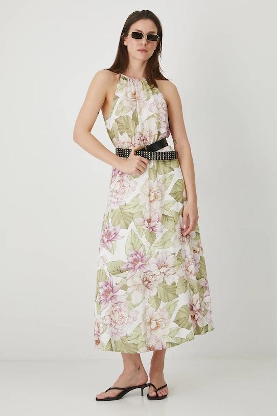 Платье из коллекции «Медицина». Расклешенный фасон из узорчатой ткани. - Расклешенный крой. - Модель без рукавов. - Вырез-чокер. - Завязывается сзади. - Эластичный пояс. - Узорчатая ткань. - Узор с цветочным мотивом. - Модель макси длины. - Ширина талии (до растягивания): 31 см. - Ширина талии (после растяжения): 48 см. - Ширина груди: 48,5 см. - Длина: 129,5 см. - Размеры указаны для размера: S.