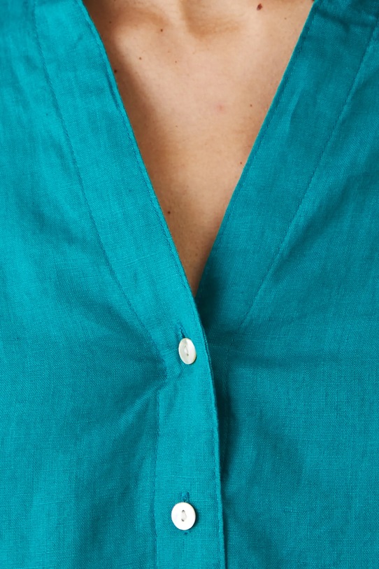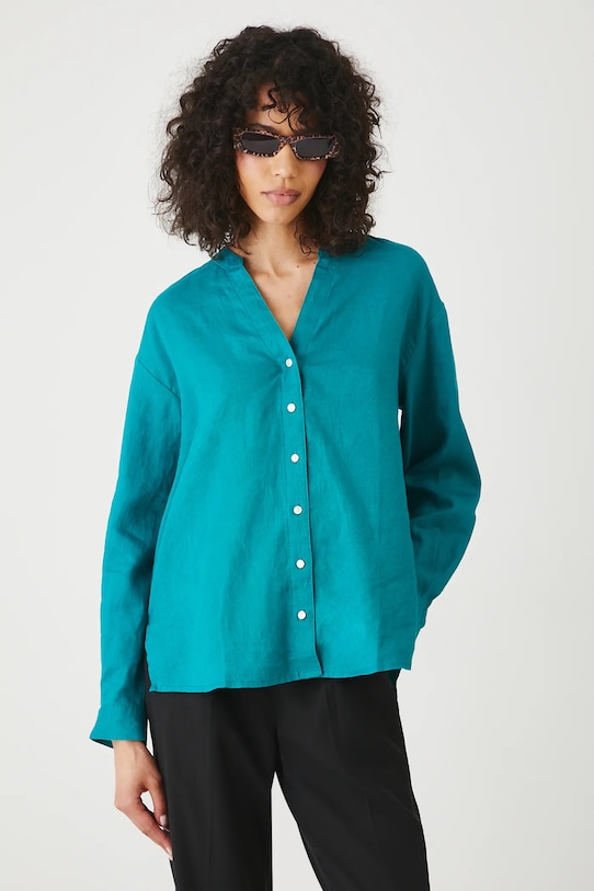 Эта блузка из коллекции Medicine выполнена из льна и имеет заостренный вырез. - Натуральный, воздушный и прочный материал, изготовлен из 100% льна. - Большой размер. - Заниженная линия плеча. - Острый вырез. - Длинный рукав. - Гладкая ткань. - Манжеты на пуговицах. - Застежка на пуговицы. - Длина рукава (от горловины): 71,5 см. - Ширина груди: 57 см. - Длина: 68 см. - Размеры указаны для размера: S.