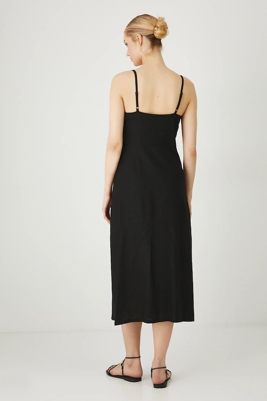 Платье из коллекции «Медицина». Приталенная модель из смеси льна и вискозы. - Льняной материал обеспечивает комфорт и воздухопроницаемость. - Приталенный крой. - Модель без бретелек. - Регулируемые ремни. - Острый вырез. - Застежка на пуговицы. - Застежка-молния. - Декоративные оборки. - Гладкая ткань. - Модель длины миди. - Ширина талии: 38 см. - Длина: 115 см. - Размеры указаны для размера: S.