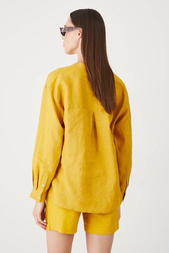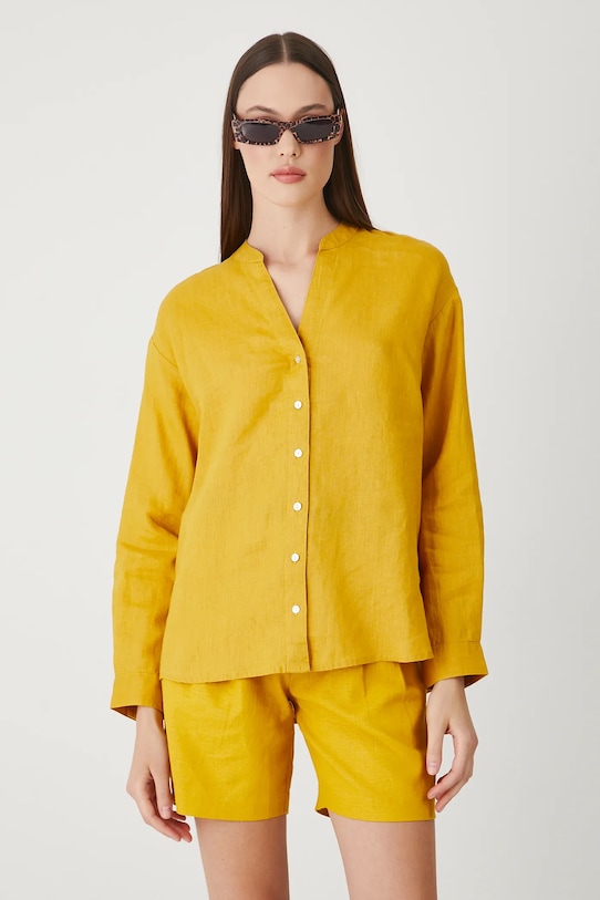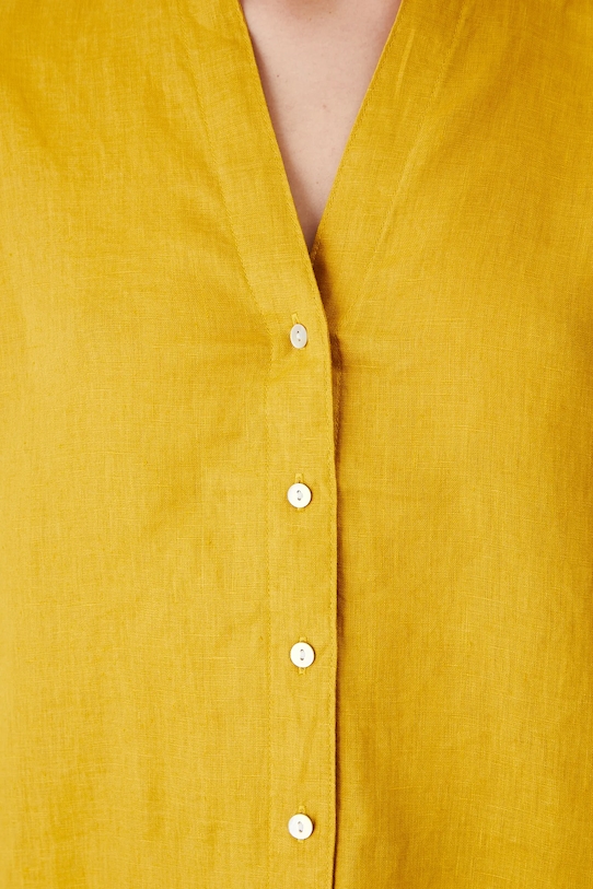Эта блузка из коллекции Medicine выполнена из льна и имеет заостренный вырез. - Натуральный, воздушный и прочный материал, изготовлен из 100% льна. - Большой размер. - Заниженная линия плеча. - Острый вырез. - Длинный рукав. - Гладкая ткань. - Манжеты на пуговицах. - Застежка на пуговицы. - Длина рукава (от горловины): 71,5 см. - Ширина груди: 57 см. - Длина: 68 см. - Размеры указаны для размера: S.