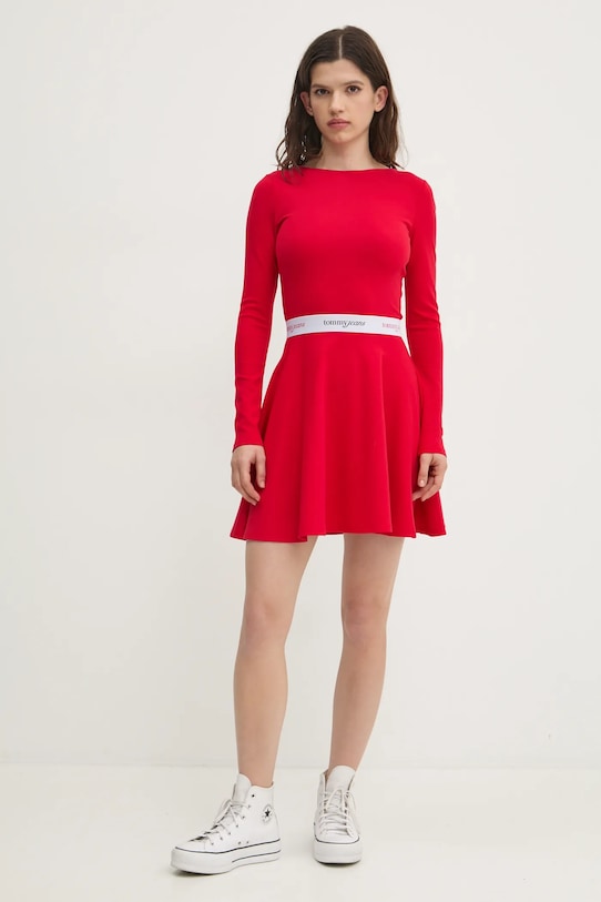 Это платье Tommy Jeans выполнено из трикотажного полотна с аппликацией. Оно изготовлено из исключительно комфортного материала с высоким содержанием вискозы. - Расклешенный крой. - Вырез горловины «лодочка». - Модель с открытой спиной. - Тонкий, эластичный трикотаж. - Эластичный пояс. - Длина рукава: 57 см. - Длина: 81 см - Ширина под мышками: 37 см. - Ширина талии: 30 см. - Размеры указаны для размера: S.
