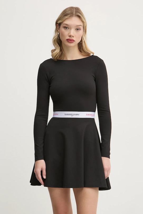 Это платье Tommy Jeans выполнено из трикотажного полотна с аппликацией. Оно изготовлено из исключительно комфортного материала с высоким содержанием вискозы. - Расклешенный крой. - Вырез горловины «лодочка». - Модель с открытой спиной. - Тонкий, эластичный трикотаж. - Эластичный пояс. - Длина рукава: 57 см. - Длина: 81 см - Ширина под мышками: 37 см. - Ширина талии: 30 см. - Размеры указаны для размера: S.