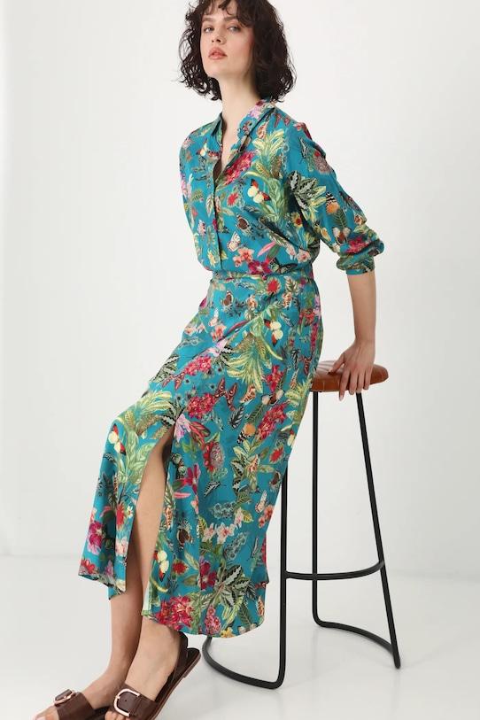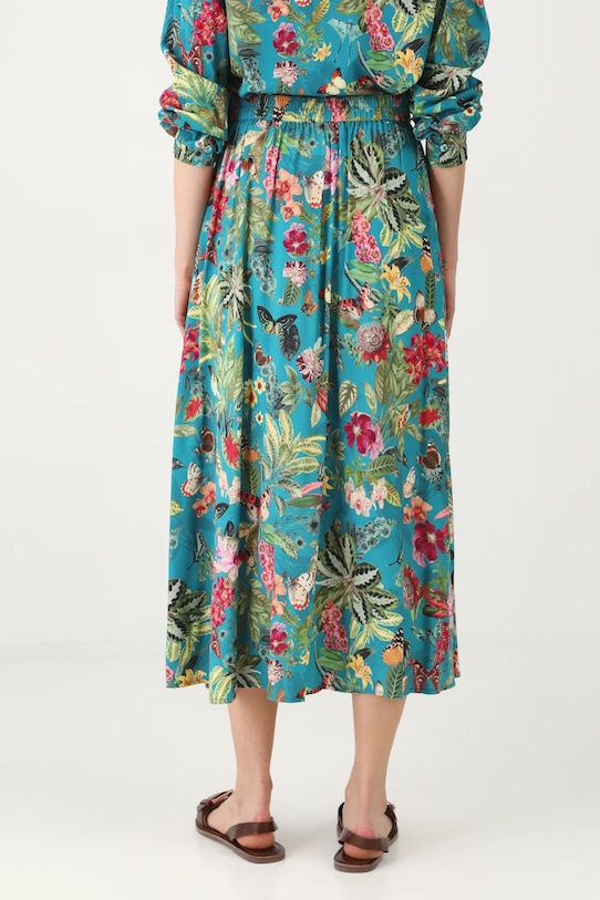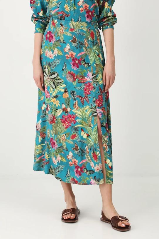 Юбка из коллекции «Медицина». Расклешенный фасон из узорчатой ткани. - Расклешенный крой. - Высокая талия. - Эластичная резинка сзади. - У него есть щель. - Декоративные пуговицы. - Узорчатая ткань. - Узор с растительными и животными мотивами. - Модель макси длины. - Ширина талии (до растягивания): 36 см. - Ширина талии (после растяжения): 49 см. - Длина: 89,5 см. - Размеры указаны для размера: S.